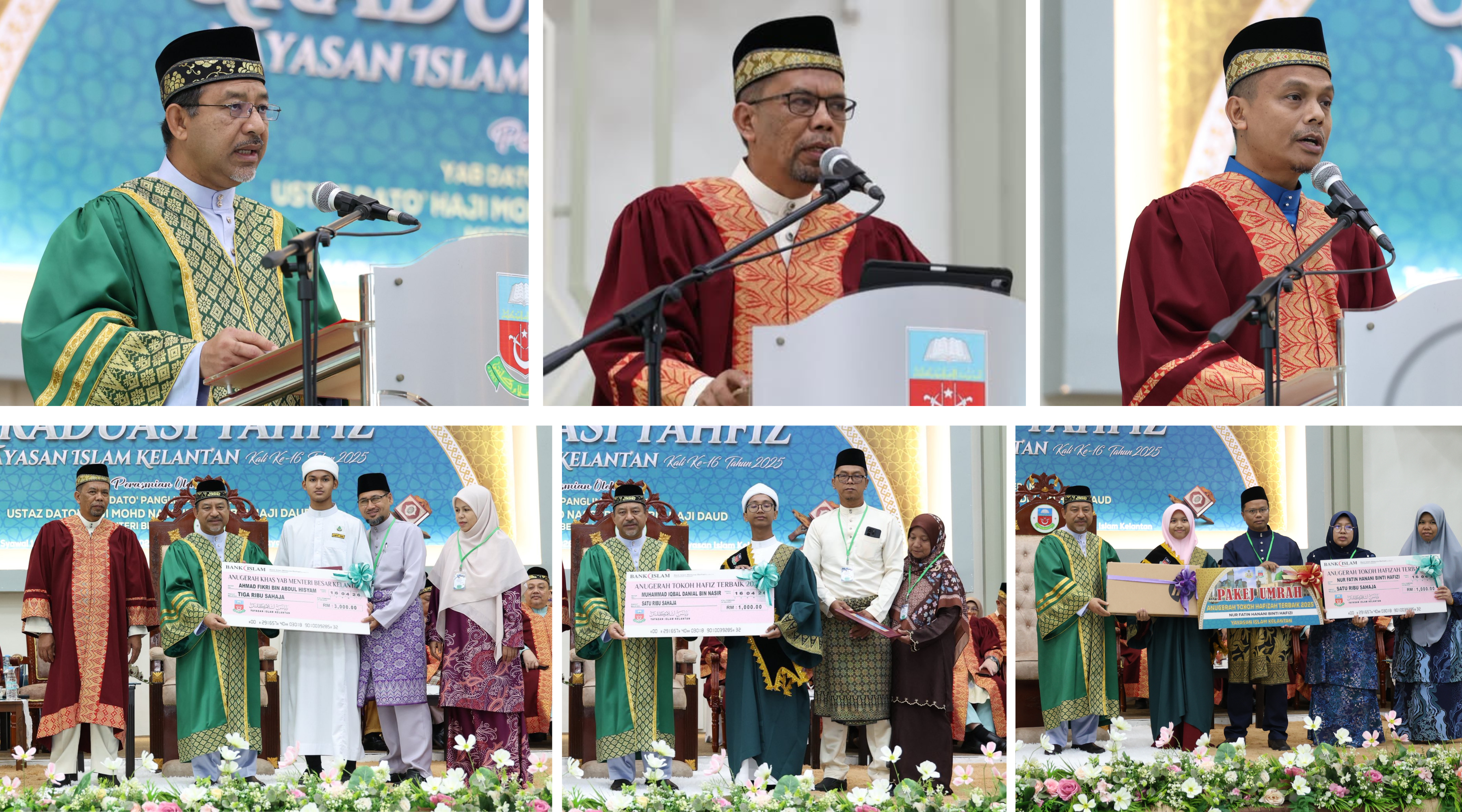 Dewan Besar YIK, Tunjong: 16 April 2026 – Seramai 432 pelajar yang berjaya menamatkan hafazan 30 juzuk telah diraikan di Majlis Graduasi Tahfiz Yayasan Islam Kelantan (YIK) Kali ke-16 Tahun 2025. Majlis telah disempurnakan oleh YAB Dato’ Panglima Perang Ustaz Dato’ Haji Mohd Nassuruddin bin Haji Daud, Menteri Besar Kelantan yang telah menyampaikan sijil khatam hafazan kepada 252 pelajar pada sesi pagi manakala bagi sesi petang pula telah disempurnakan oleh YB Dato' Ustaz Haji Wan Roslan bin Wan Hamat, Pengerusi Jawatankuasa Pendidikan, Pengajian Tinggi, Teknologi Hijau, Digital dan Inovasi Negeri Kelantan yang telah menyampaikan sijil khatam hafazan kepada 180 orang pelajar. Turut hadir Bersama ialah YABrs. Tuan Haji Shamsul bin Abu Bakar, Pengarah YIK dan Ahli-ahli Mesyuarat Lembaga YIK.